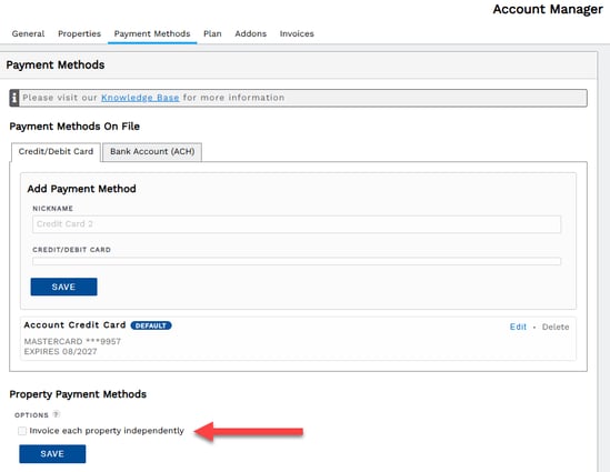 To confirm and manage your invoicing selection, go the the Payment Methods tab in Account Manager. In the section titled "Property Payment Methods", at the bottom of the page, you will find the option to "Invoice each property independently". When this option is checked, you enable independent billing for each property.