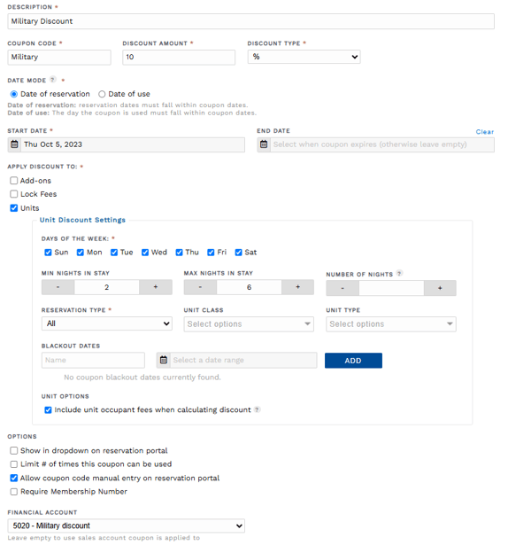 Apply Discount To - Coupons can be applied to unit charges, add-on charges, and/or lock fee charges. Specify which charge types will qualify for discount.