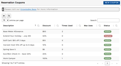 Coupons are a great way to give guests a discount. It is common to give senior discounts, membership discounts, employee discounts, and promotional discounts. Coupons may also be used for allowances such as workcamper credits or base utility credits. No matter how you use them, coupons are a great way to pass reduced pricing to your guests.