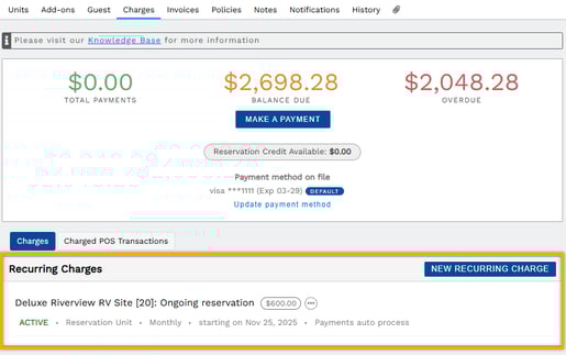 To manually add a recurring charge, go to a reservation's Charges tab. Find the Recurring Charges section. Select “New Recurring Charge”, highlighted below.