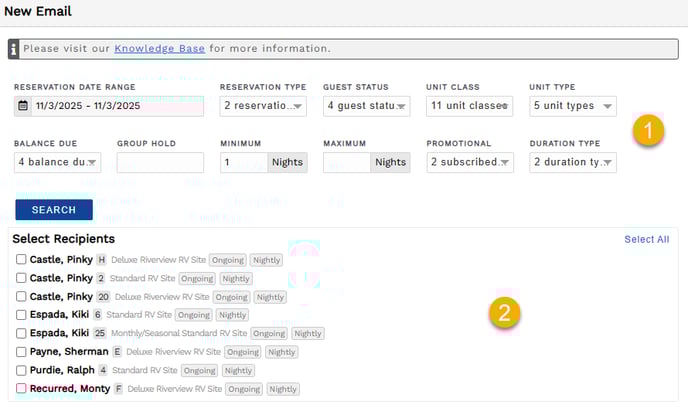 - Select guests using the blue Select All shortcut or click on the box of each desired guest from the provided recipients list