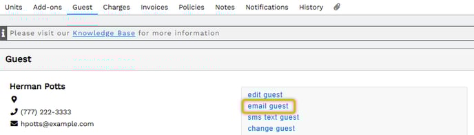 When working in a reservation's details page, you can quickly send a custom template email to the guest from the Guest tab.