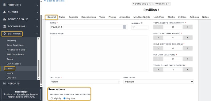 To use the Day Use Reservation feature, you will need to update the unit settings for your units that you wish to book single day reservations. This is perfect for pavillions, event space while also applicable to other scenarios.