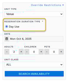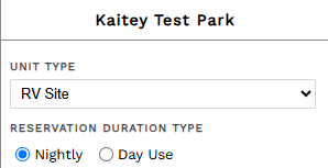 To create a Day Use Reservation, you can follow the process to create a new reservation anywhere you would typically create a new reservation in Firefly. When choosing a unit, if the unit is set to "Day Use" the option for a single day will appear in the system.