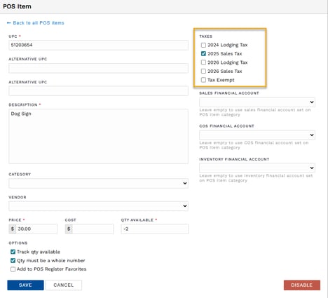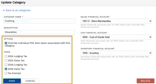 For a more efficient process, especially useful if you have many items to change, you may edit the tax settings on your POS Item Categories and use the "Override individual POS item taxes" option to push the tax change to all items in the category. You must ensure every POS item is designated to a category to use this option. If unfamiliar, POS Item Categories setup is found on the main menu in the Settings dropdown.