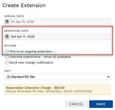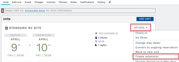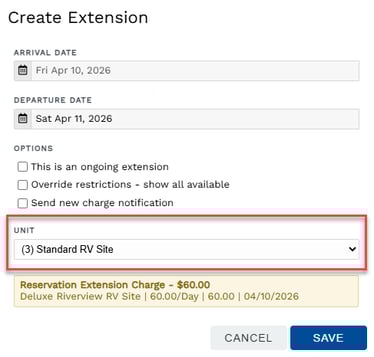- Extensions create a separate Reservation Unit charge for the additional night(s). The charge of the original reservation unit remains as it was prior to the extension.