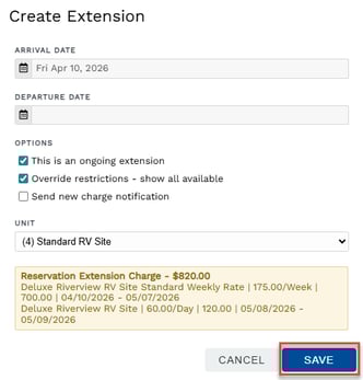 If you would like to make changes to the extension's charge, you may save the extension then edit the charge on the reservation's Charges tab.