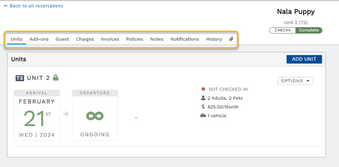 There are tabs at the top of every reservation to quickly help you navigate to the following: