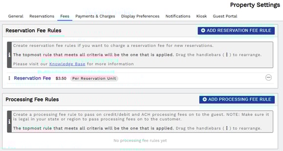 On the Fees tab, you can set up reservation or processing fees to pass along to your guests. For more information on setting up pass-thru fees, check out this article: Custom Reservation Fees
