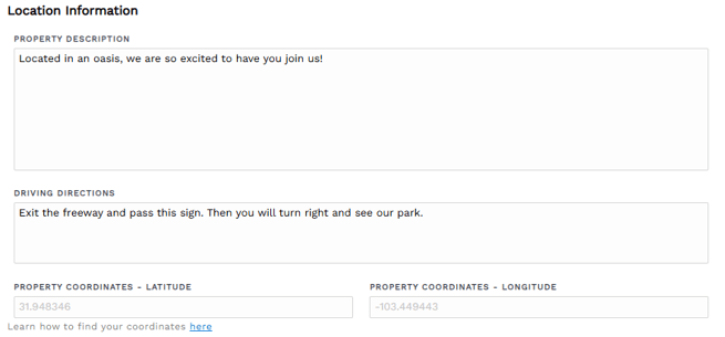 Under "Location Information" you can update your property description, driving directions, and property coordinates.