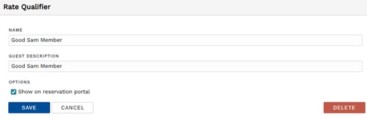 - Check the Show on reservation portal option if you want the qualifier to be available on the reservation portal. This allows the guest to apply the qualifier's special rate to their reservation.