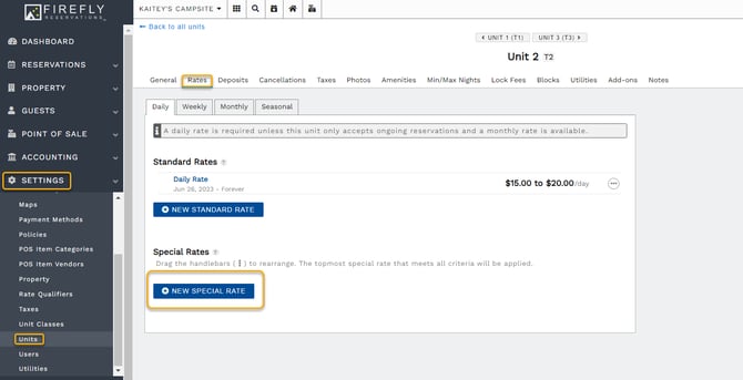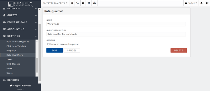 If you want to change the rate applied to a reservation's charge when a rate qualifier is selected, you will edit the special rate in a unit's settings. Navigate to the unit's Rates tab, find the special rate linked to the rate qualifier, and update the pricing as desired.Delete a Rate Qualifier