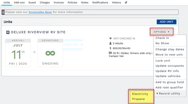 - On a reservation's Units tab, click the Options dropdown for the desired unit.