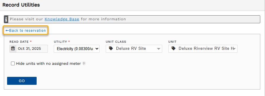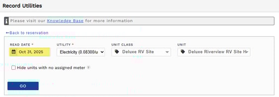 - Enter the date for the meter reading then click Go. The other boxes are pre-filled since you initiated the recording through the reservation.
