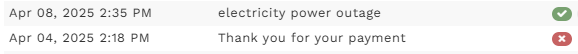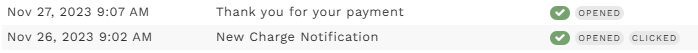 An icon with a white checkmark inside a green oval appears to the right of the email subject if an email was successfully delivered to the guests email inbox. A red oval with a white X appears if the email failed. If no icon is displayed, Firefly has not yet received a final success or failure message from the recipient's email provider and may be continuing delivery attempts. You can check back in a few hours or the next day for a final delivery status.