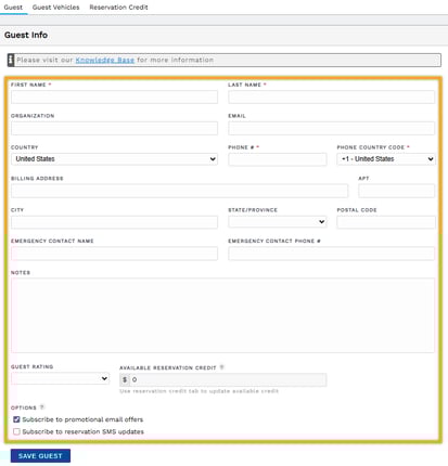 It's important to store information about your guests. Firefly has a built in guest book where you can find basic contact information, notes, vehicle information, reservation credits, and a historical record of reservations made in Firefly.