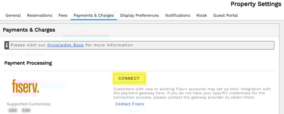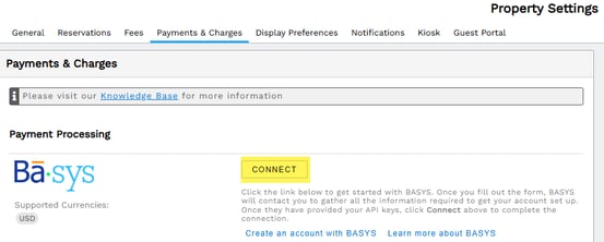 Once your processor credentials are received, go to Settings > Property. Select the Payments & Charges tab. Click the Connect button next to BASYS.