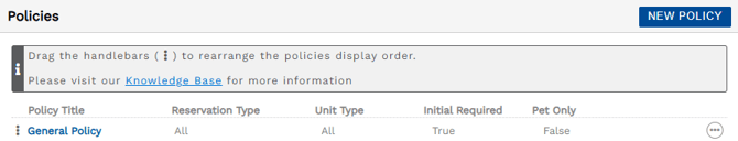 To add a new policy, go to Settings > Policies. By default, you will have one “General Policy” that is editable using the three dots on the right-hand side. You will then be inside the specific policy’s setup page to fully customize it to your liking and standard. Like the email templates, placeholders may be sued to auto-populate the guest's information in the custom fields.
