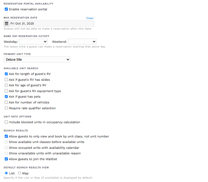 Reservation Portal Availability If you want to turn off all availability for your park from the online portal, check the box to do so