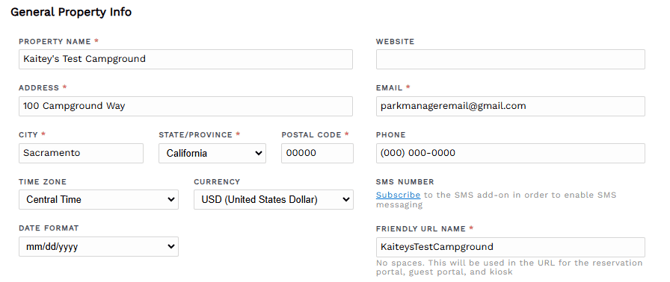 Under "General Property Info" you can update your property name, website, address, email, time zone, currency, pIn the General tab, you will enter your property name, address, phone, and email address. You can find or subscribe to your SMS Messaging number, and update your Friendly URL Name.