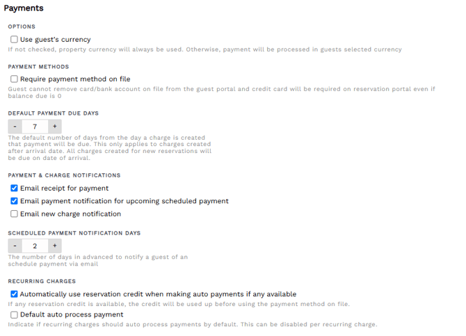 Recurring Charges Choose to check or uncheck these settings around recurring charges that may be created for ongoing reservations.