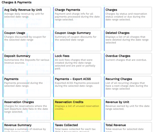 To access the Reservation Credits report, go to Firefly's main menu and select Reports.