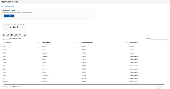 The report shares a guest's first and last name, credit amount, and whether a credit is associated with the guest's profile or a reservation. Click on a line item in the report to open the guest's profile for guest credit or the reservation for reservation credit.
