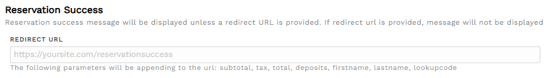 A customizable reservation success message will be displayed once the reservation is completeTIP: Instead of a Reservation Success message, shown above, you may choose to immediately redirect guests back to a specific page of your website. It's an easy change using the Redirect URL option on the Property Settings' Reservations tab.