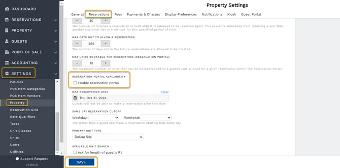 - Scroll to find "Reservation Portal Availability" setting and uncheck the box